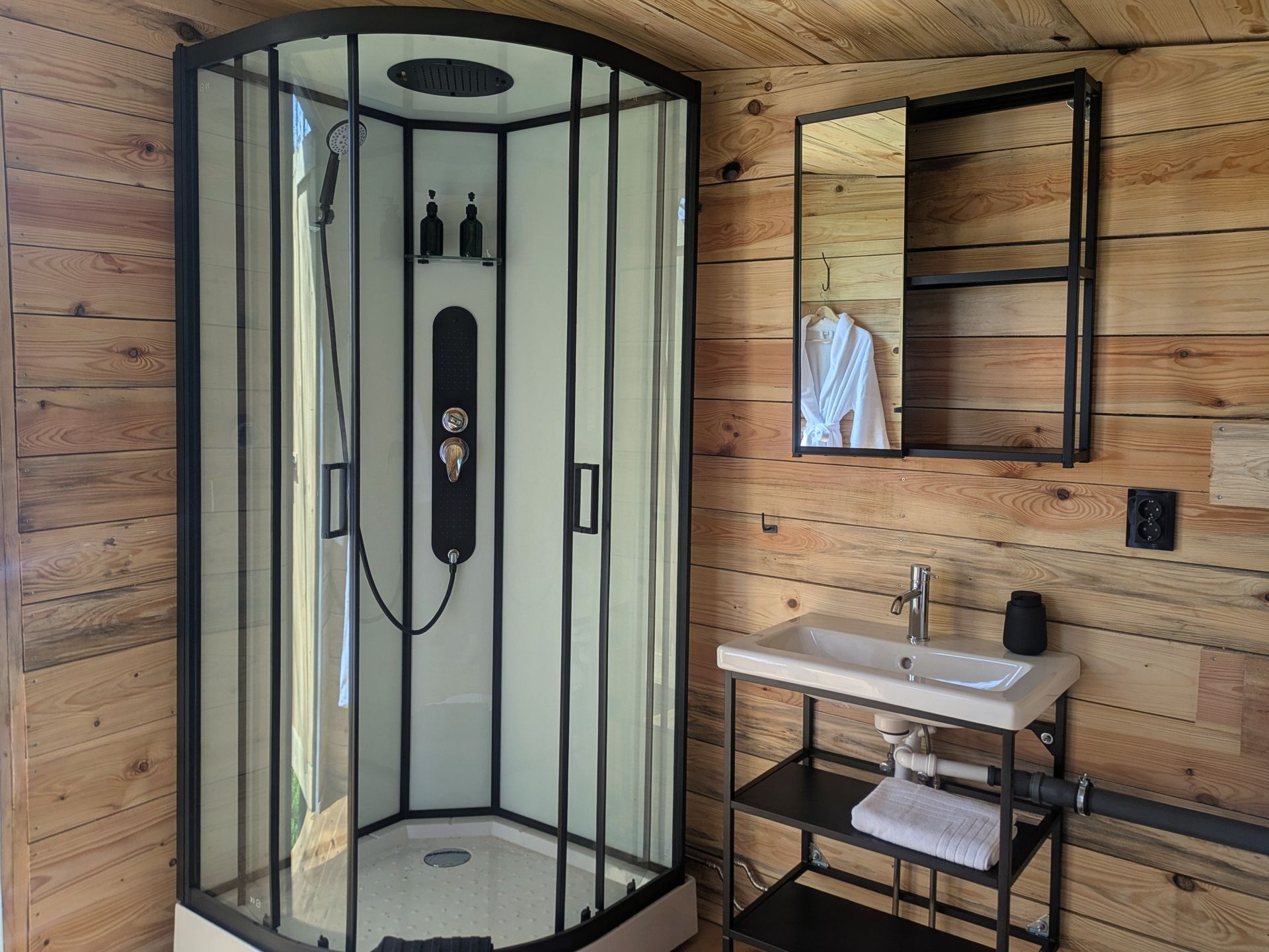 Zu jeder Einheit gehört ein eigenes Badehäuschen, das mit Rainshower-Dusche, Waschbecken und Trockentrenntoilette ausgestattet ist.